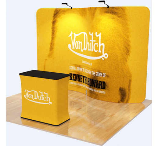 The 10′ Serpentine Zip Up WaveLine Tension Fabric Display is a jaw-dropping display. Measuring 10ft wide and 8ft high, this unique Serpentine display allows you to take advantage of as much space as you can get. This exhibit has an easy to assemble collapsible aluminum bar frame. The depth permits the display to be sturdy while maintaining style. The Serpentine can be purchase with two LED lights that easily attach to the frame, allowing for bursts of highlights and dimensions. The high resolution display graphic is printed on tension fabric that zips up similar to a pillowcase over the frame. Conveniently, the durable hard case can be converted into a counter with a fabric conversion skirt.