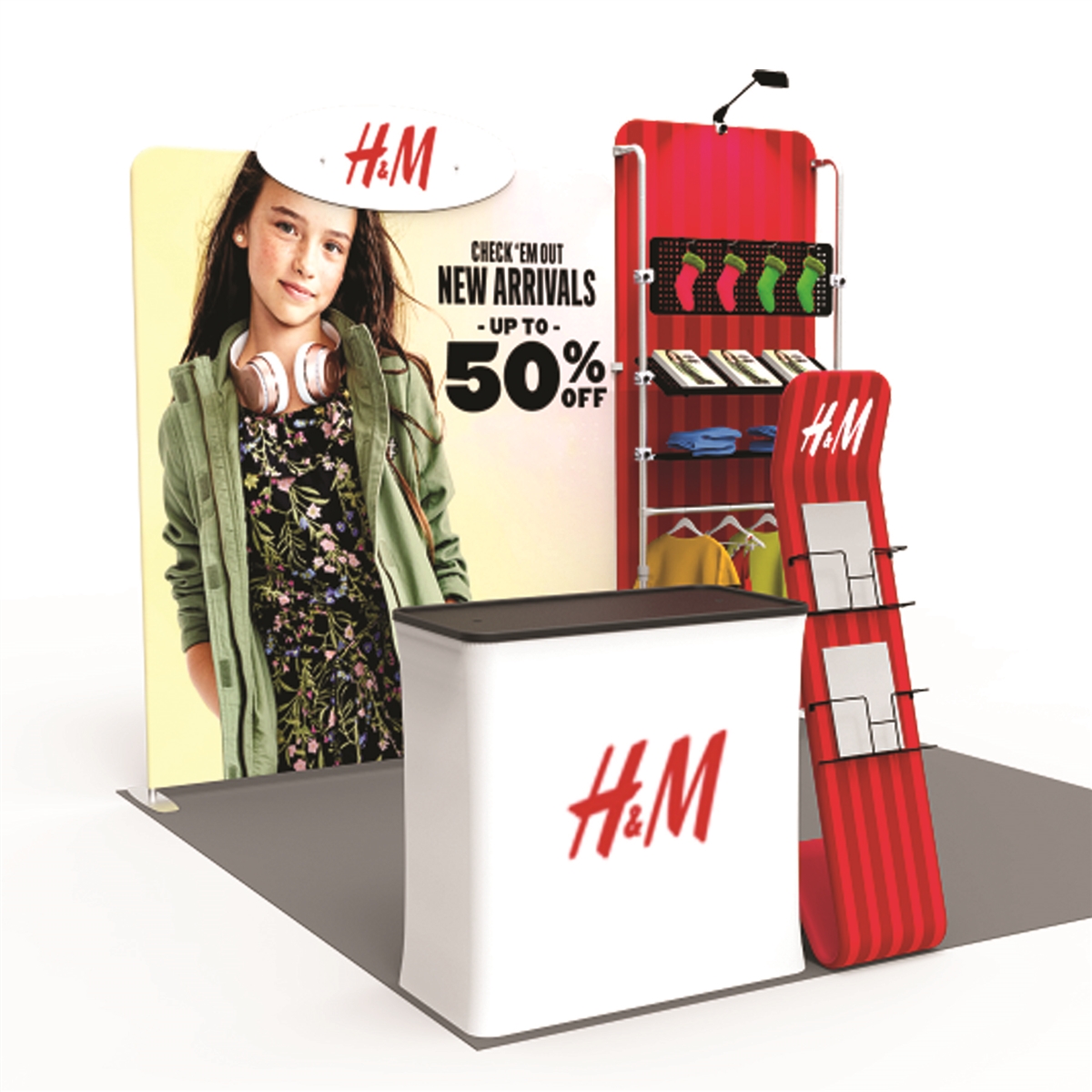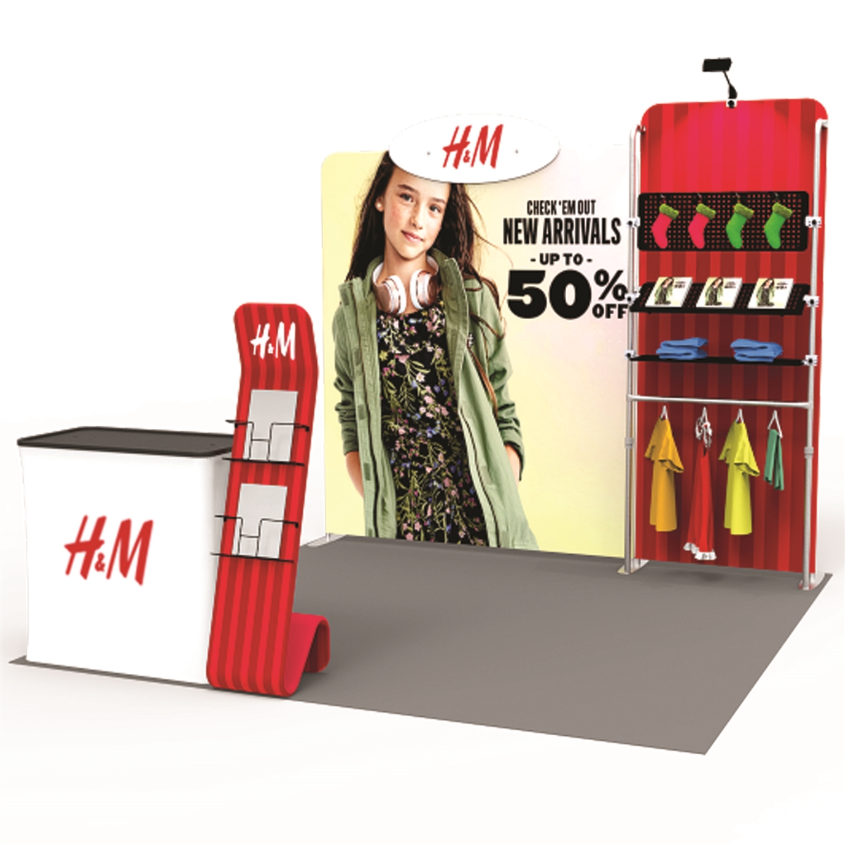 The modular design of the H&M booth makes it highly versatile, easily adjustable to suit different event layouts and sizes. Whether you’re displaying apparel, accessories, or promotional materials, this booth can adapt to your needs, making it a worthy investment for various types of businesses.
