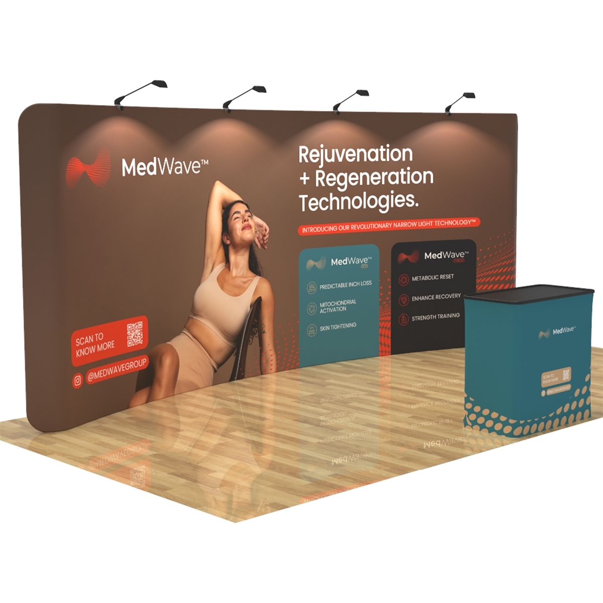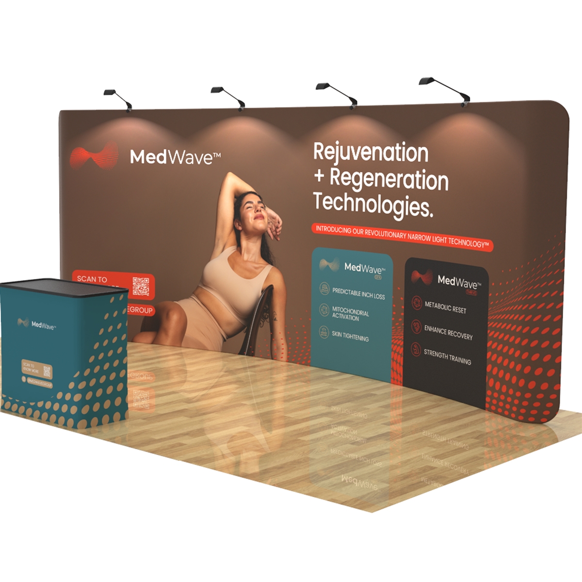 Our 10 X 20 Ft Curved Trade Show Booth with Podium – Med Wave is perfect for your event needs.