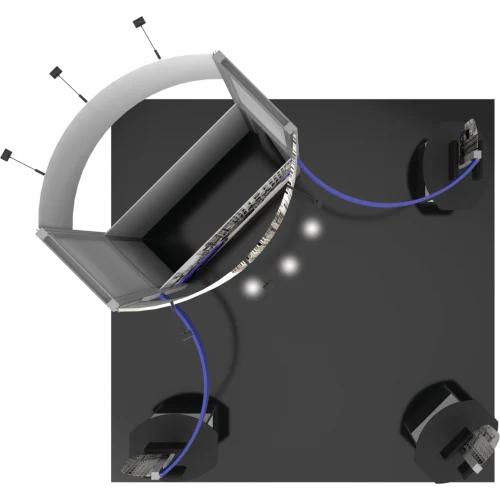 - A trio of kiosks combining dual monitor mounts, rigid display panels and counters with locking storage provide additional room for messaging, functionality and storage. LED display lighting atop the central tower illuminates messaging for a clear display.