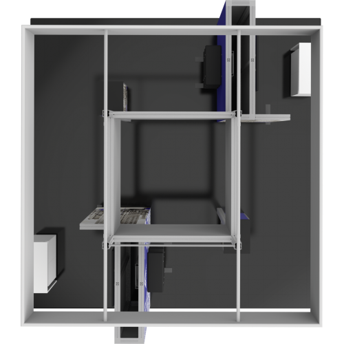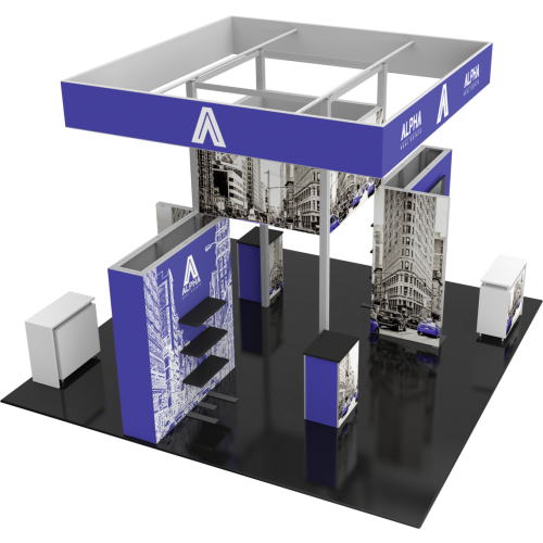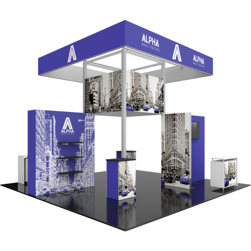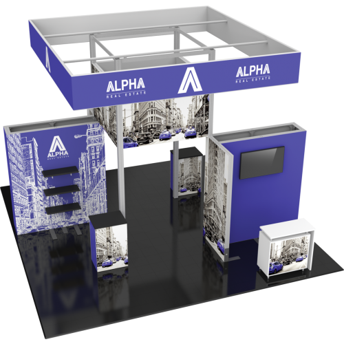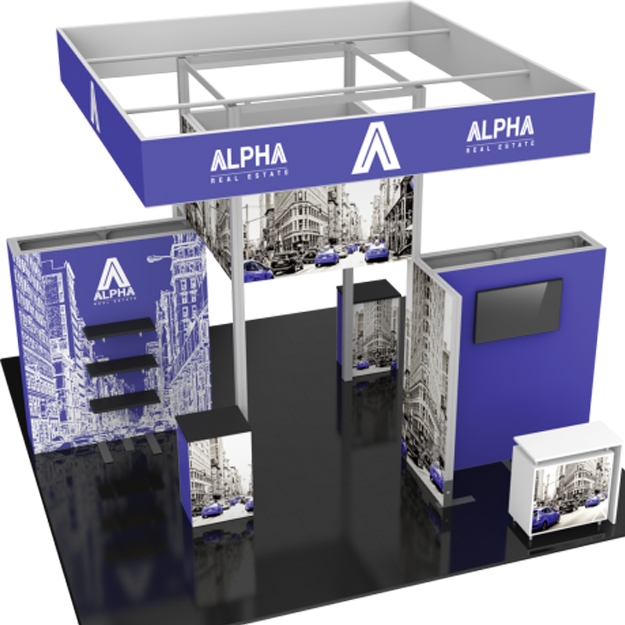 Hybrid Pro Modular Kit 23 is a sophisticated and symmetrical 20ft x 20ft island exhibit, perfect for an exhibitor looking for features and functionality. Kit 23 features a heavy-duty aluminum extrusion center frame that supports two square-shaped fabric structures. The top fabric structure is a tube structure with pillowcase fabric graphics and is meant to display your company logo so all in the exhibit hall can see it from afar! The center square utilizes the extrusion posts to create an additional area for branding and messaging above eye-level. Two 8ft tall floor displays add features and functionality. With medium monitor mounts and three shelves for small product display on each, the floor-based displays are designed to show and communicate your service offering in digital form and your product in physical form. Counters near the center posts add areas for storage and reception.