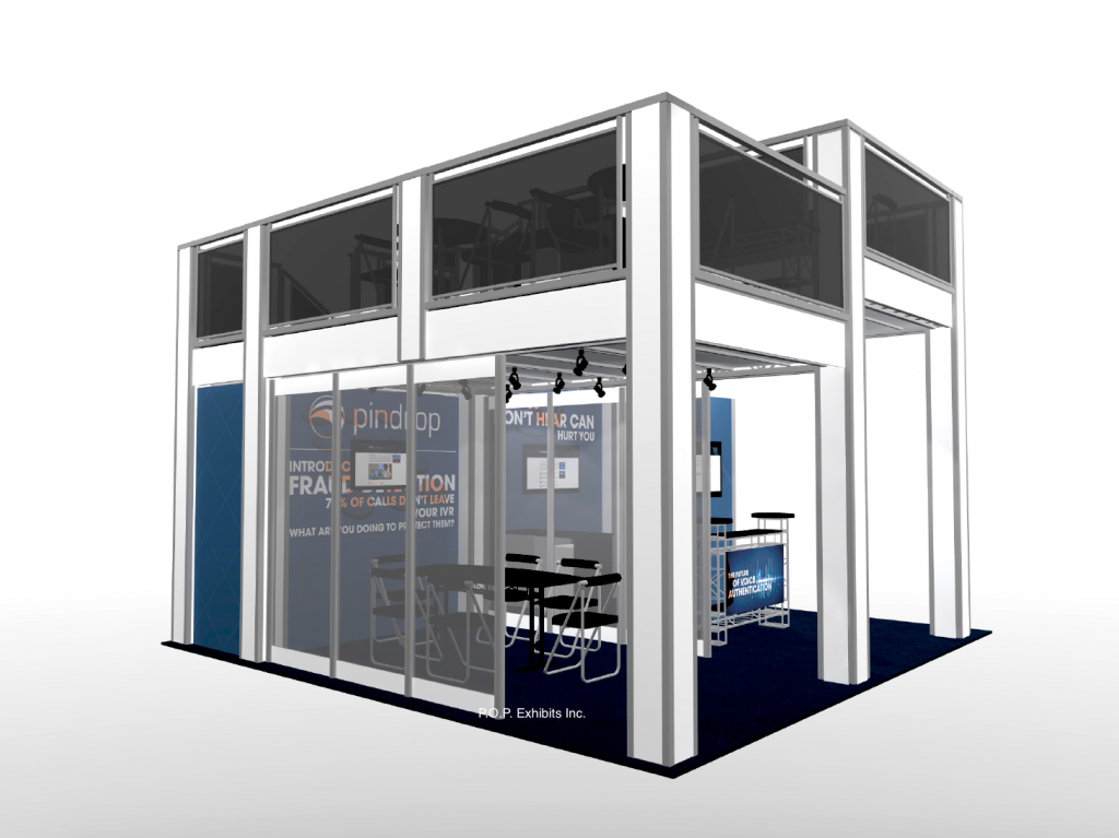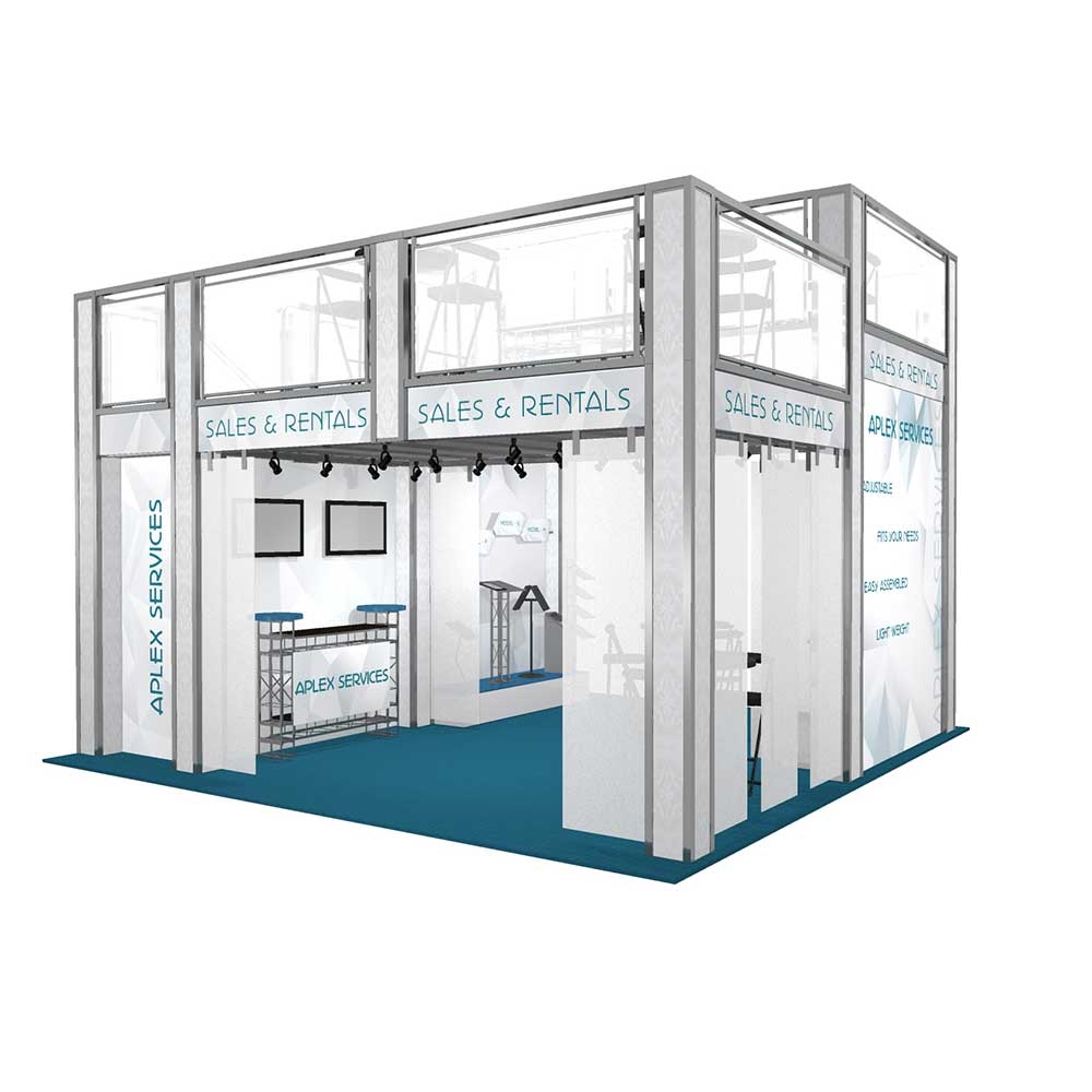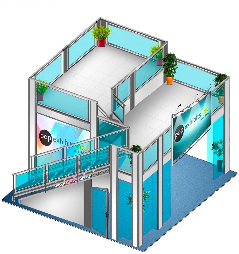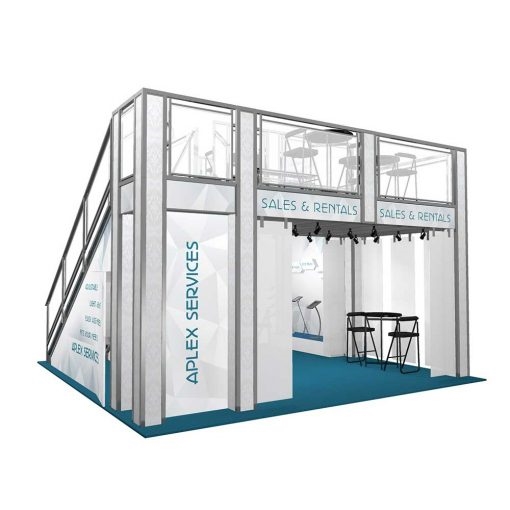 The 20 x 20 Split Level Double Deck Truss Display System combines the 9 x 9 deck with a straight staircase and landing for a private meeting area that doesn’t take up the floor space with this booth.