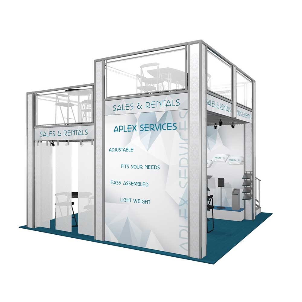 The primary benefit of this double-deck display is its unique split-level second story. This innovative design allows you to create distinct zones on the upper deck—perhaps a casual lounge on one level and a more private, elevated VIP meeting space on the other. This provides a far more dynamic and functional environment than a standard flat deck, making it one of the most versatile conference booth displays available.