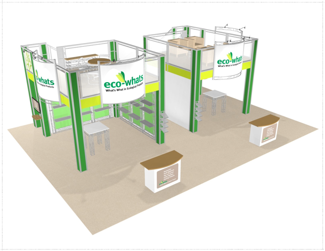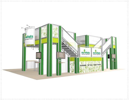 How do you communicate your brand’s commitment to sustainability on a truly massive scale? You need an exhibit that not only tells your story but embodies it. The 30×40 Eco-whats Double Deck Truss Display System is that solution—a monumental, two-story structure designed to be the ultimate platform for eco-conscious brands. A thoughtful and impactful exhibit design of this size requires a partner who understands both engineering and powerful messaging, setting us apart from other trade show booth design companies.