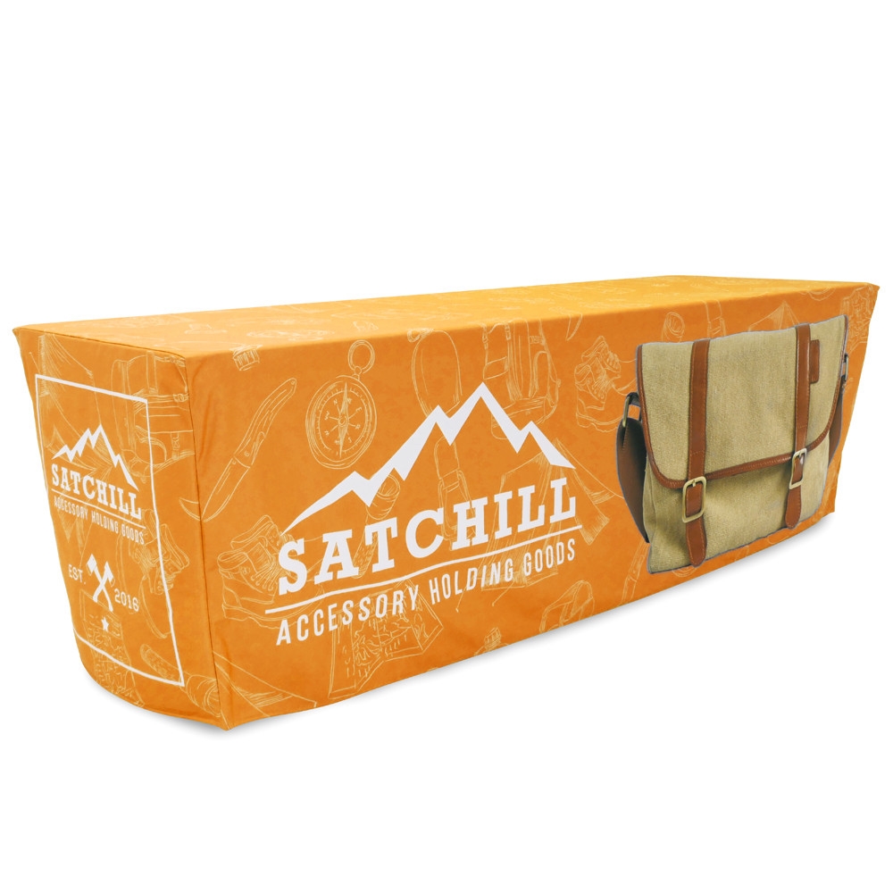 Get your graphic edge-to-edge custom printed on fitted table throw that is made to fit 8 ft. tables. - This option is 4-sided, fully covering the front, back and sides of the table.