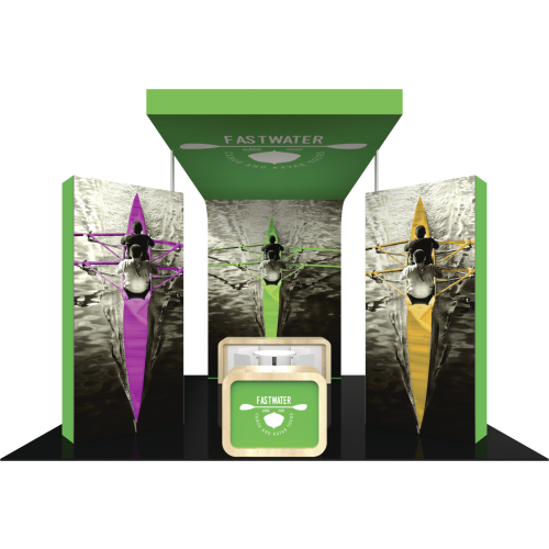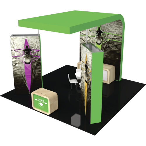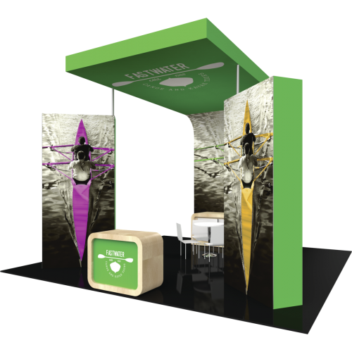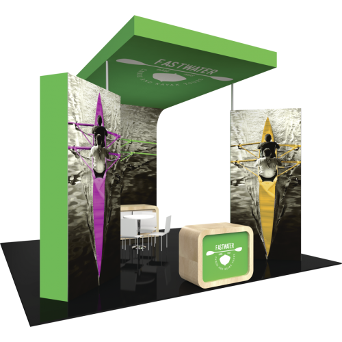 • The rectangular structures combine heavy duty aluminum extrusion frames with push-fit fabric graphics, which are designed for bold, vibrant graphics and messaging! A freestanding laminated reception counter establishes the area for exhibit staff to meet and greet guests.