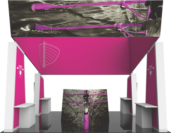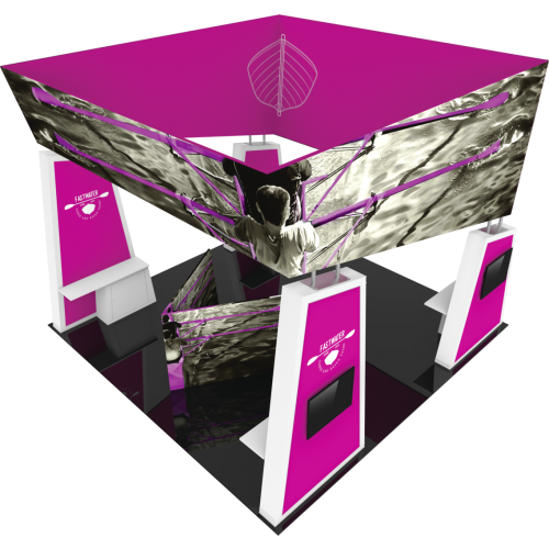 • The large fabric hanging structure provides a plethora of real estate for branding, imagery and messaging to draw visitors into the exhibit space.
