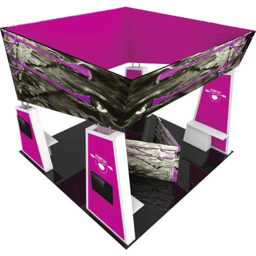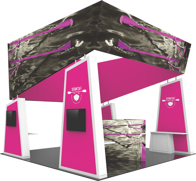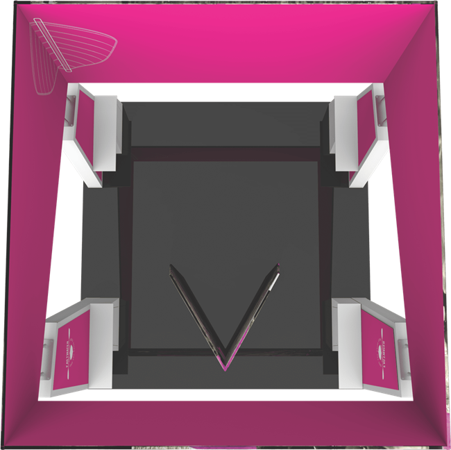 This bold and dominant 20′ x 20′ exhibit certainly won’t be one that attendees simply walk past. A big, bold trapezoidal-shaped fabric structure rests on top of the four mirrored trapezoidal-shaped corner towers.