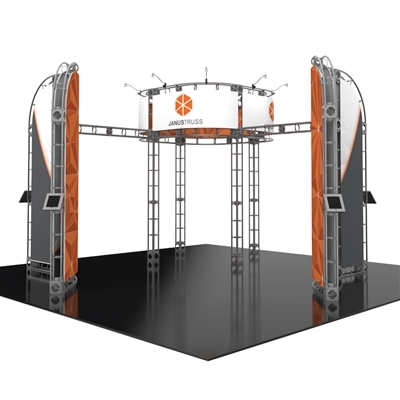 The Janus 20×20 Orbital Express Truss Exhibit is part of the planetary line of Orbital Truss Trade Show Kit. The Janus trussTM features over 40 professionally designed “off-the-shelf” kits for a variety of booth sizes and configurations. Each Janus kit comes complete with all the parts, fixtures and fittings you needto create a successful exhibit, including (depending on the kit) low voltage spotlights and adjustable tabletops.