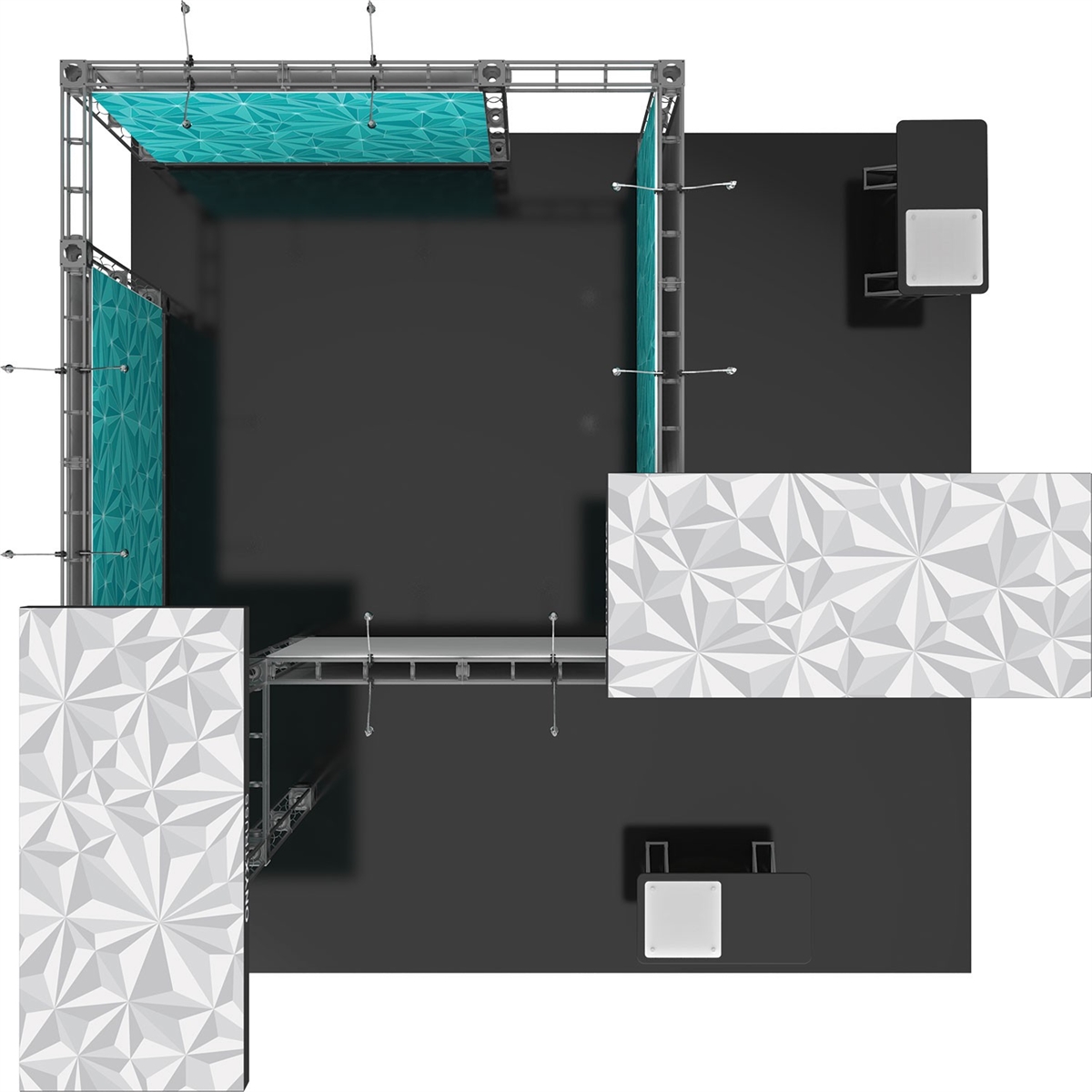 Tradeshow competition at your next event can be fierce! Start your next season with a new 20ft x 20ft truss island displays and leave the competition in the dust. This new Onyx 20′ x 20′ Island Orbital Express Truss Exhibit Kit is the latest of the planetary line of Orbital Truss Trade Show Kit. The Onyx trussTM features over 40 professionally designed “off-the-shelf” kit. Onyx kit comes complete with all the parts, fixtures and fittings you needto create a successful exhibit, including (depending on the kit) low voltage spotlights and adjustable tabletops. The main feature are the two staggered towers allowing your display to be seen from every angle and the semi private meeting room. The basic rectangular counter with graphics is fixed to the counter with stand-offs giving the counter a staining and unique look. If you looking for audio visual equipment then this is your exhibit as it features a LCD/LED Monitor mounts on the smallest tower that is modular, meaning it can be moved. The Lumina spotlights do a great job illuminating the space with 24 spotlights!