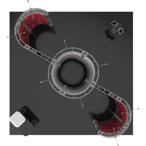 The Zenit’s design opens up a world of effective uses. The prominent circular header is the perfect place for your primary logo, creating a 360-degree branding opportunity. You can place a central reception counter directly beneath it to create a natural welcome point. The open space on all sides is ideal for setting up multiple product demonstration kiosks or comfortable seating areas. This versatile layout makes it one of the premier conference booth displays for creating an interactive, multi-zone experience. The tall backwall is also a perfect canvas for a massive video screen, transforming your booth into a dynamic presentation hub.